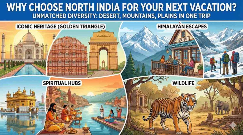 North India is not just a destination; it is an emotion. From the timeless romance of the Taj Mahal to the spiritual chaos of Varanasi, and from the golden sands of Jaisalmer to the snow-capped peaks of Manali, this region offers a kaleidoscopic journey through India’s soul.