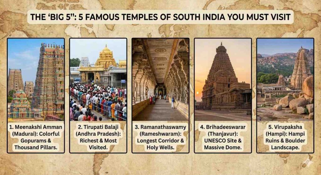 Before we dive into the itinerary, here are the 5 famous temples of South India that form the core of any South India pilgrimage Tour itinerary: