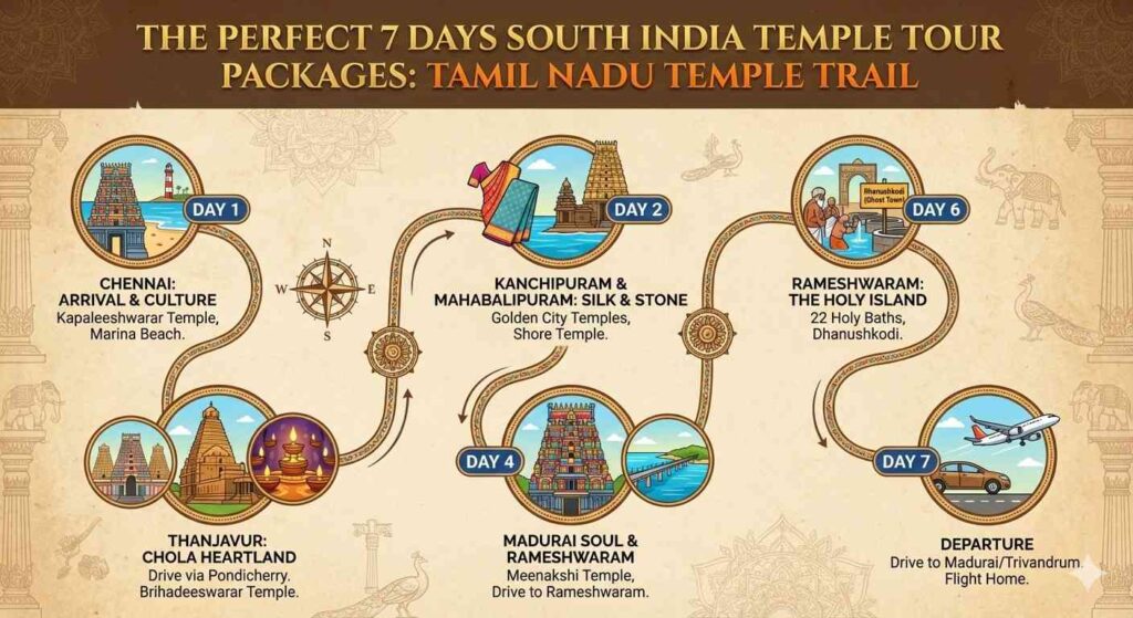 For a comprehensive spiritual experience, a 7 Days South India Temple Tour Package typically covers: