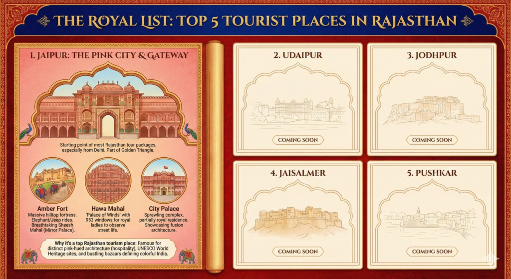 Whether you are looking for Dream vacation ideas, a Rajasthan tour packages for family getaway, or a culturally immersive Trip planning guide, this article is your Perfect trip planner. We have grouped the essential stops into the Top 5 tourist places in Rajasthan that define its royal legacy.
